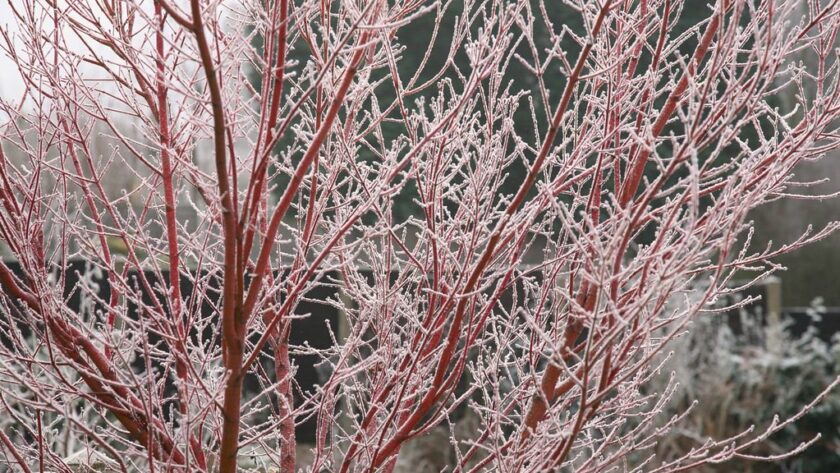 Uno de los arces japoneses más populares por su increíble corteza roja es Acer palmatum ‘Sango-Kaku’, un arbusto grande o pequeño árbol que puede alcanzar 6 metros de altura a los 10 años, y en el que destaca la alta saturación de color rojo coral brillante de su corteza, que es particularmente visible durante el invierno y principios de la primavera.