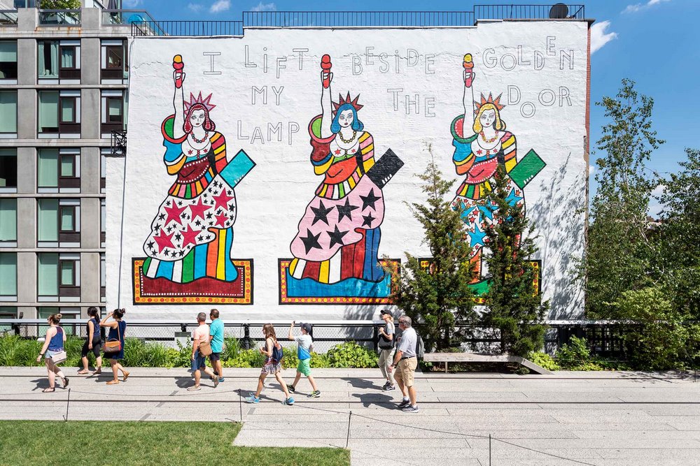 Lo cierto es que la High Line de Nueva York se dedica desde su inicio a expandir el papel del arte contemporáneo en los espacios públicos. Hoy, mi propuesta consiste en hacer un pequeño recorrido por esa larga avenida elevada, para disfrutar, no solo de la vegetación casi espontánea que le da sentido y valor al emblemático parque, sino también, para descubrir en imágenes algunas de las pinturas y otras obras de arte ubicadas en diferentes localizaciones; además de la imponente escultura en el Spur y una gran instalación de murales en la calle 22.