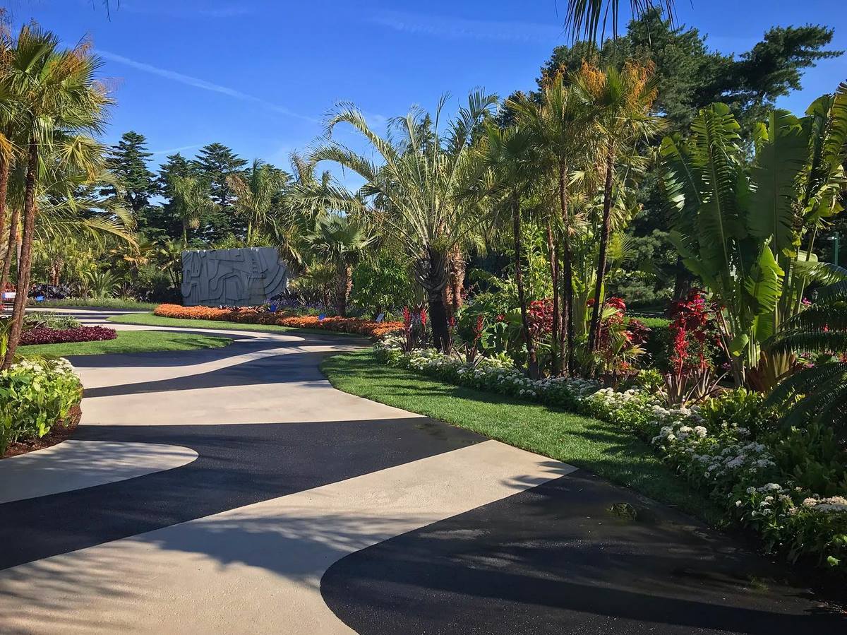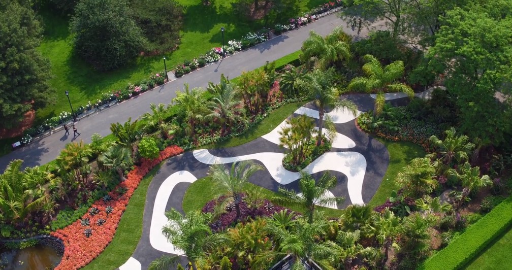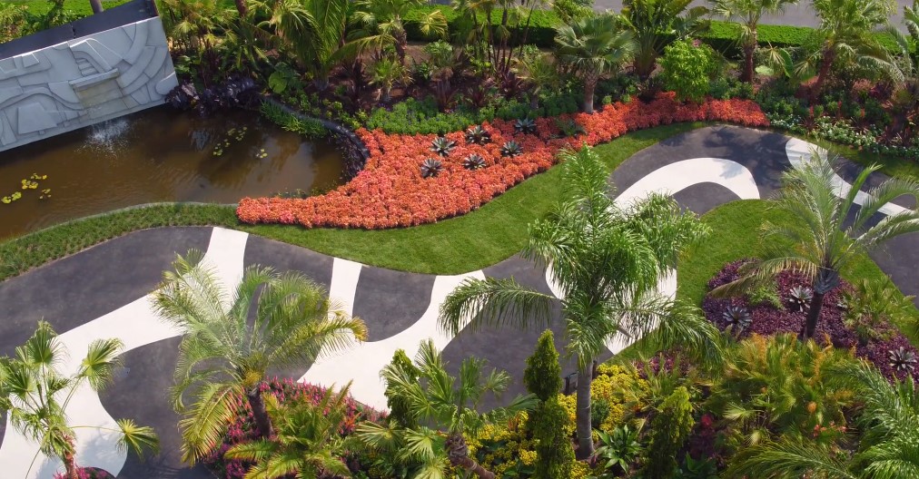 En el diseño de paisajes urbanos, Burle Marx jugaba con formas geométricas y orgánicas, utilizando pavimento estampado inspirado en los estilos portugueses. En este caso, Jungles diseñó un camino biomórfico de dos tonos. El pavimento blanco y negro se compensa con las flores brillantes y el follaje verde de las plantaciones.