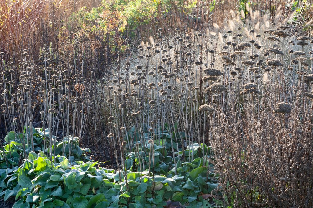 Desde el punto de vista paisajístico, las razones de retrasar el corte de los tallos florales de plantas herbáceas perennes son principalmente estéticas, ya que las cabezas de semillas secas permiten alargar el interés del jardín en los días más fríos del año, exhibiendo atractivos tonos en marrón o tostado, y ofreciendo estructura al jardín a finales del otoño y durante buena parte del invierno.