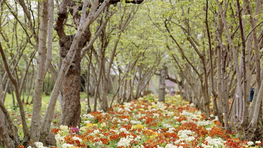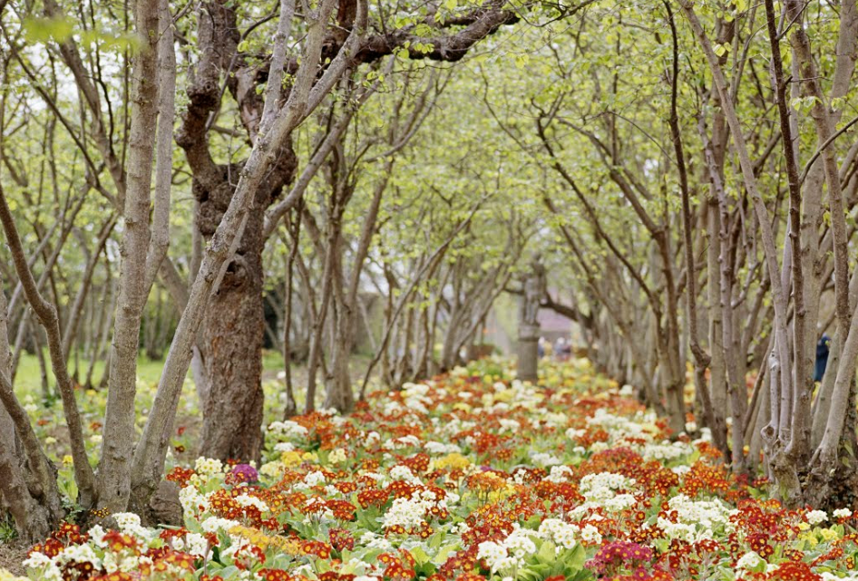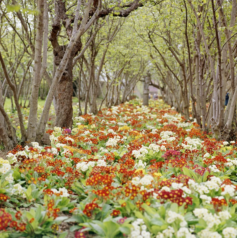 “Polyanthus flowers growing between lines of hazel trees in the Nuttery at Sissinghurst Castle” (detalle)