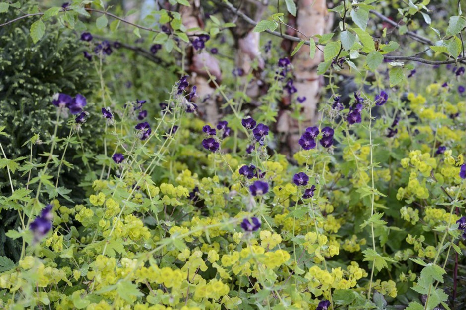 Euphorbia amygdaloides var. robbiae y Omphalodes cappadocica ‘Cherry Ingram’ •• FOTO Gardeners’ World