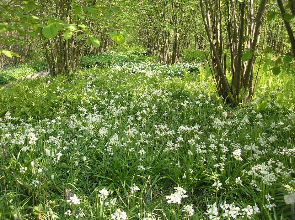 A medida que avanza la primavera, lo hace también el color amarillo ácido de algunas plantas, como Euphorbia amygdaloides var robbiae y Smyrnium perfoliatum. El color verde lima lo aporta el follaje de Veratrum; Matteuccia struthiopteris yOnoclea sensibilis, y el azul profundo las flores de Omphalodes cappadocica ‘Cherry Ingram’. También salpican de tonos blancos las flores de Maianthemum stellatum; un cultivar de flores blancas de Hyacinthoides hispanica; Polygonatum odoratum ‘Variegatum’ y Trillium grandiflorum.