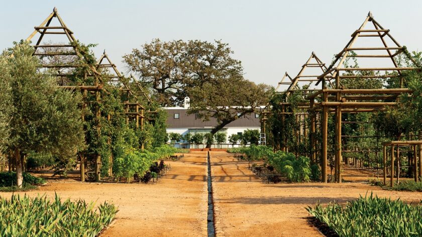 Pero lo mejor, sin duda, es su granja de 200 hectáreas, donde se cultiva frutas, verduras, plantas aromáticas y viña. Hay corrales y palomar. Sus jardines geométricos están alineados como si de un tablero de ajedrez se tratase. En el diseño del jardín se ha tenido en cuenta fundamentalmente la estructura . Las especies se alinean de forman que florecen en una ola de una fila a la siguiente. Los patos patrullan los viñedos y los visitantes pueden pasear descalzos por caminos de manzanilla calmante.