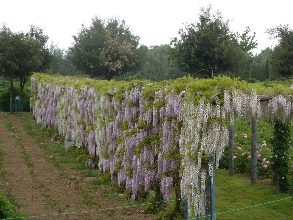 Entre abril y mayo, los túneles de paseos con glicinias (Wisteria sinensis) se unen a esta fiesta de color de las peonías, proporcionando con su espectacular floración sombra y deliciosa fragancia a los visitantes.