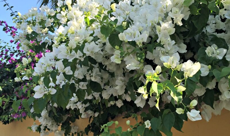 Una buganvilla (Bougainvillea), esa planta veranera donde las haya, que despierta amor (por su belleza) y, en ocasiones, odio (por lo que enreda y pincha), ha vuelto a emocionarme ayer, después de llevar años observándolas, admirándolas y fotografiando sus colores vivos, colores ardientes, rojos, rosas, púrpura… Mucho tiempo, y de repente, el blanco. Mi emoción se renovó y mi mirada volvió a iluminarse.