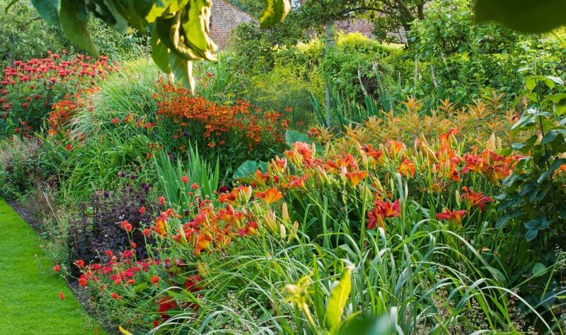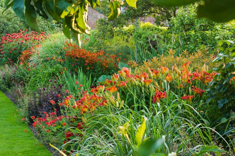 Los colores calientes para el verano vienen de la mano de una de esas secciones –Red Border-, donde la bordura inglesa se enciende con armonía de colores. Tonalidades rojas y anaranjadas que ofrecen las flores de especies de plantas, como las que se aprecian en la fotografía de Clive Nichols, que menciono a continuación: