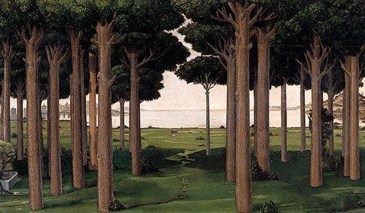 En la exposición, denominada Bosques de Luz los paisajes urbanos y los industriales son protagonistas junto a bosques italianos y paisajes agrícolas. Todo queda integrado con un propósito común, ver el paisaje y no el objeto o persona que pueda aparecer en esa escena.