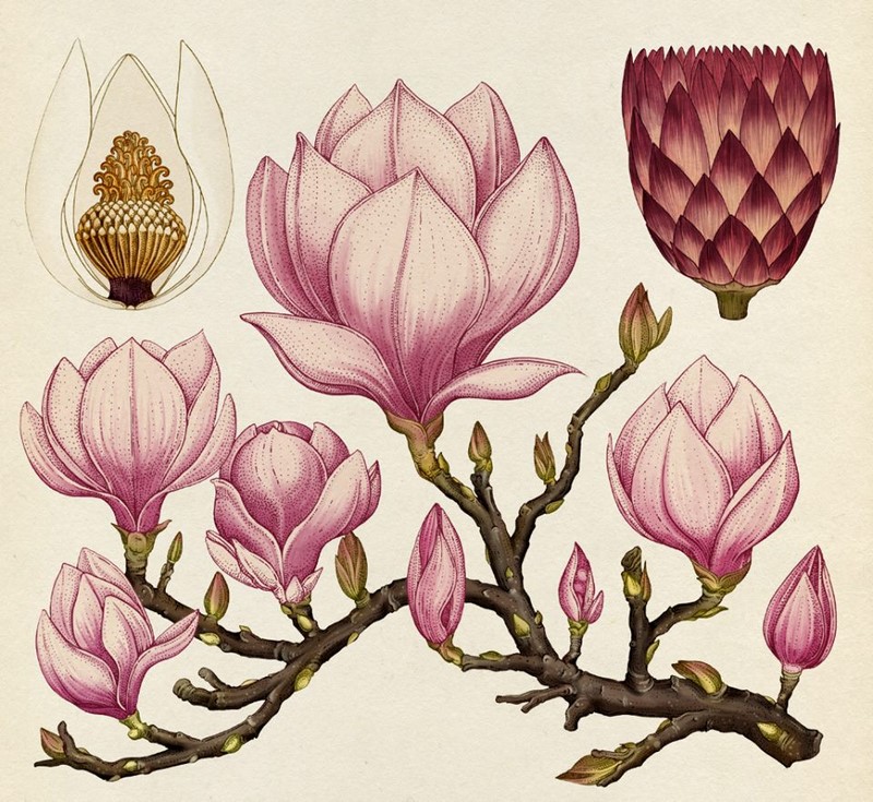 Las ilustraciones, nuevamente, son de Katie Scott, que actualmente vive y trabaja en Londres. Estudió ilustración en la Universidad de Brighton y ha trabajado en la BBC, el New York Times, Universal Records y Phaidon Press. El trabajo de Katie Scott muestra las influencias de la medicina tradicional y la ilustración botánica. Son ilustraciones realizadas en el campo, no siempre con ejemplares perfectos, lo que permite observar ciertas conjeturas y mucha licencia artística de la creadora, que hacen aún más atractiva esa reproducción. No en vano, sus ilustraciones suelen estar cargadas de buena dosis de surrealismo y mucha psicodelia.