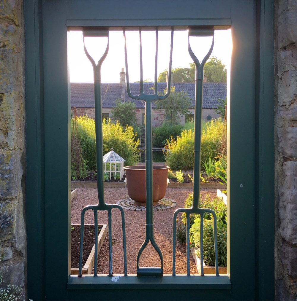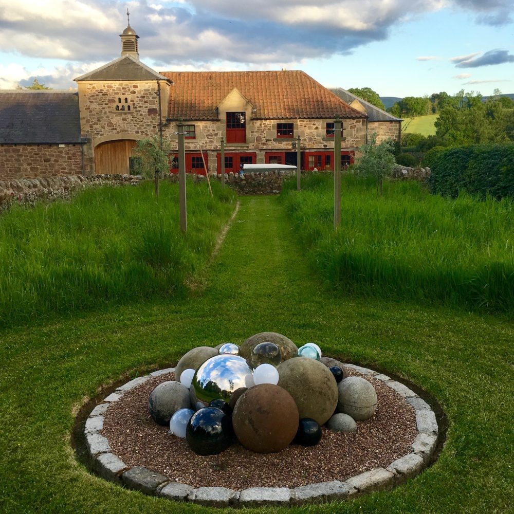 El campo que hay al norte de la casa (House Field) alberga una variedad excéntrica de objetos. Las lápidas de los perros fueron talladas por Caroline Webb en piedra de Portland, a la manera de un cementerio de guerra. Existen numerosas esculturas ‘hechas en casa’ alrededor del jardín. No falta un letrero que sugiere que no deben tomarse demasiado en serio. Y es que, no toda la fruta en el huerto es comestible. Las manzanas doradas fueron hechas por el apropiadamente llamado Brian Caster en la fundición Powderhall Bronze en Edimburgo.