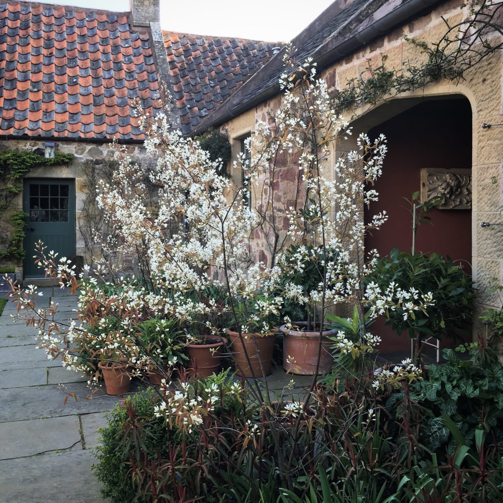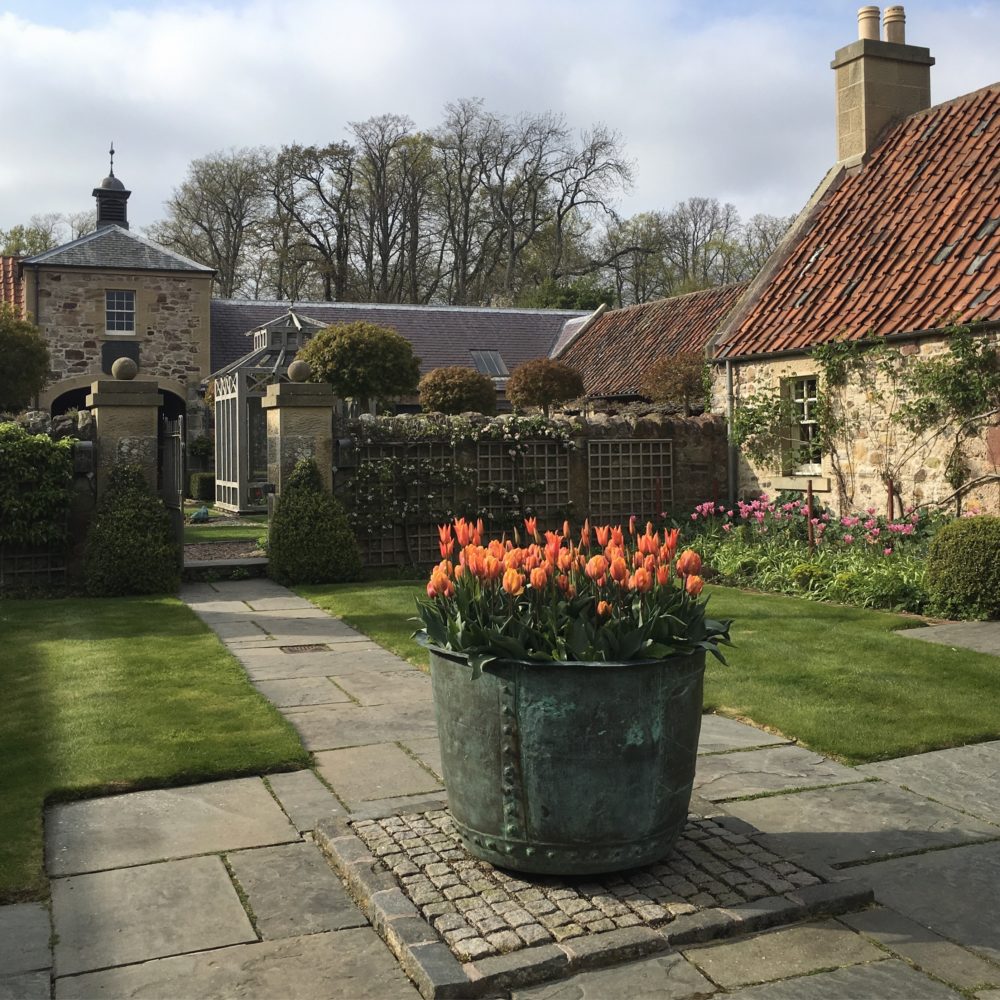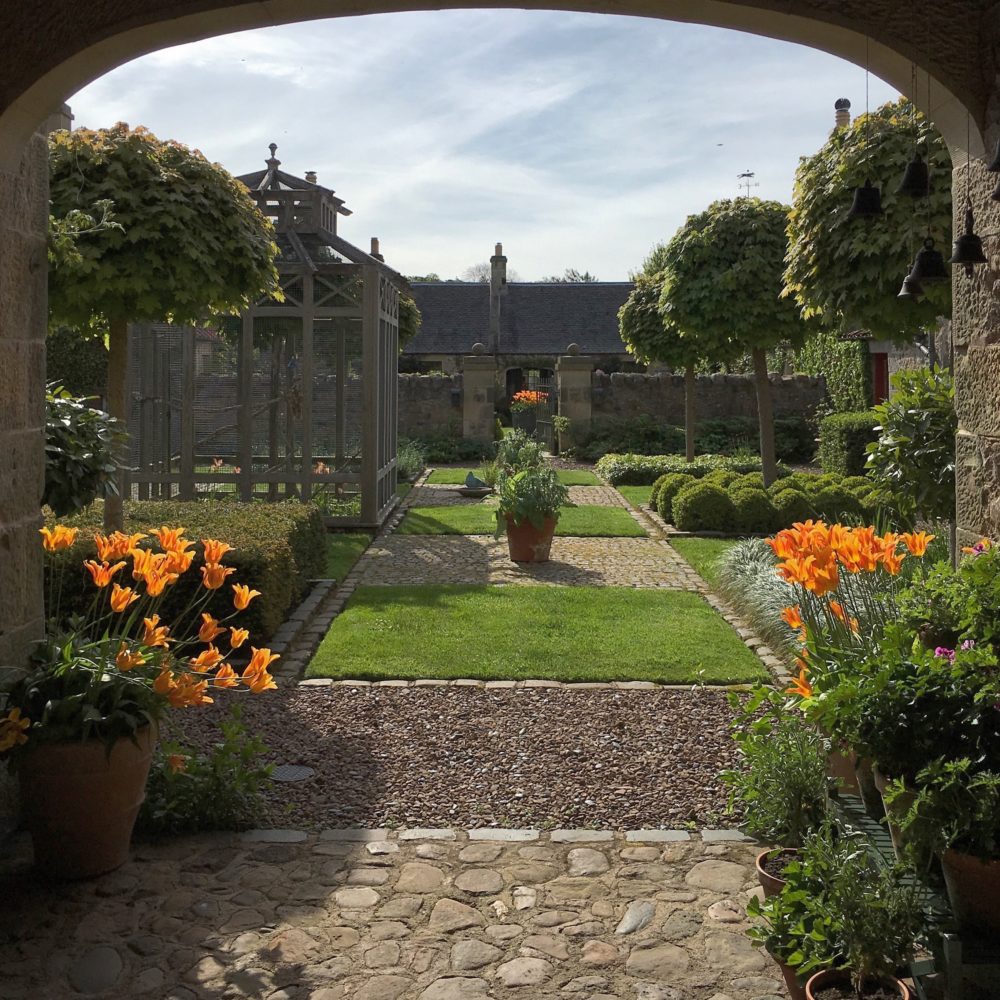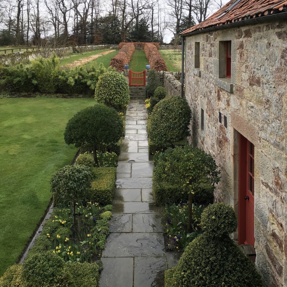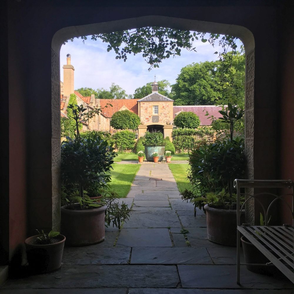 En el patio inferior, el diseño cruciforme tradicional está pavimentado con losas que provienen de los pisos de un molino en Arbroath que se estaba convirtiendo en planchas. Son areniscas Carmyllie, famosas por su excelente calidad.