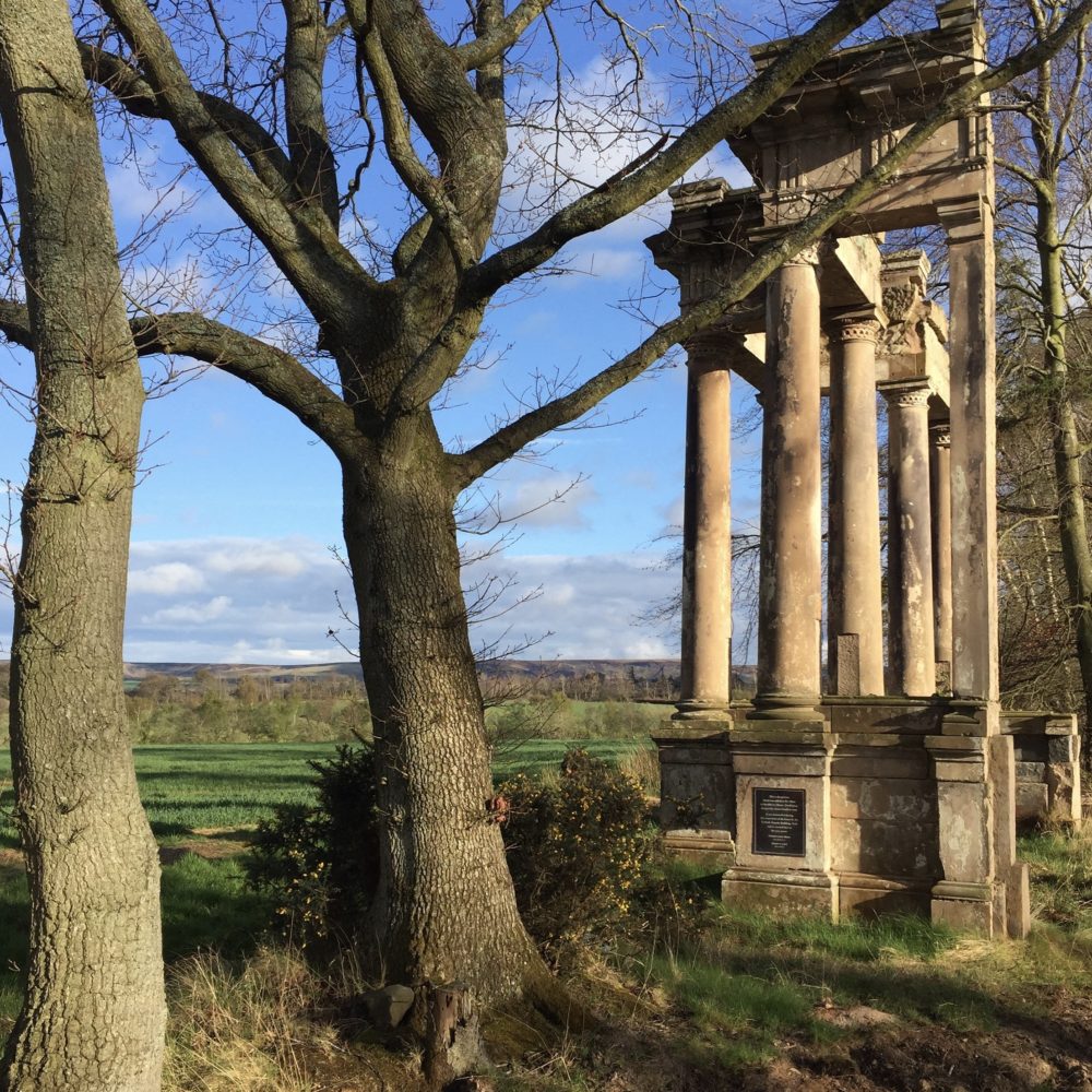 El templo al oeste de la carretera es el pórtico victoriano temprano de Strathleven House, cerca de Dumbarton. Fue desmantelado durante la restauración de la casa a su forma del siglo XVIII por el Scottish Historic Buildings Trust y re-erigido en Broadwoodside en 2000.