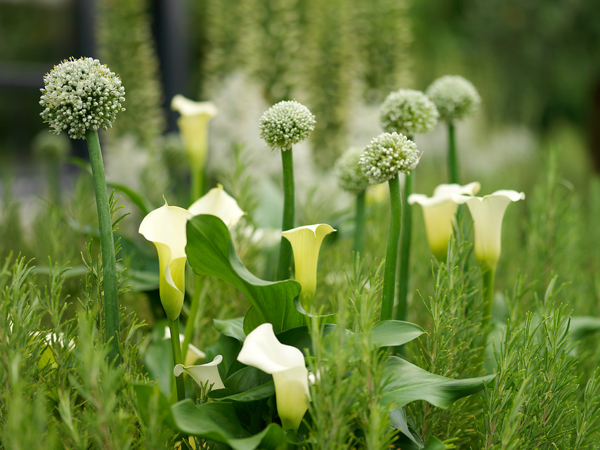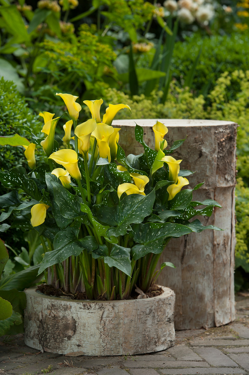 Las calas son más versátiles de lo que imaginamos. Su flor perfectamente contorneada las convierte en una opción espléndida para una terraza, patio o balcón. Además, la selección de algunas variedades en uno o dos tonos vibrantes produce un efecto magnífico.