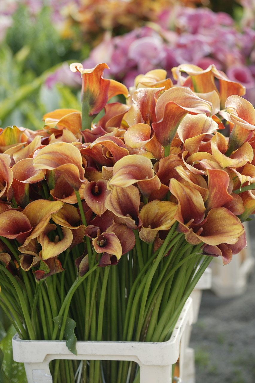 Las calas florecerán entre julio y octubre durante tres a ocho semanas, pudiendo producir tallos de treinta a noventa centímetros de altura. Su periodo de floración depende de la temperatura, cantidad de luz y variedad.