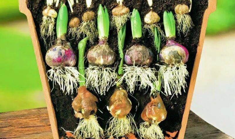 Esa es su propuesta para quienes se decidan a plantar en un contenedor tres capas de bulbosas (obviamente, de cada género, tú puedes elegir aquella especie y variedad que más te guste o de la que dispongas sin dificultad).