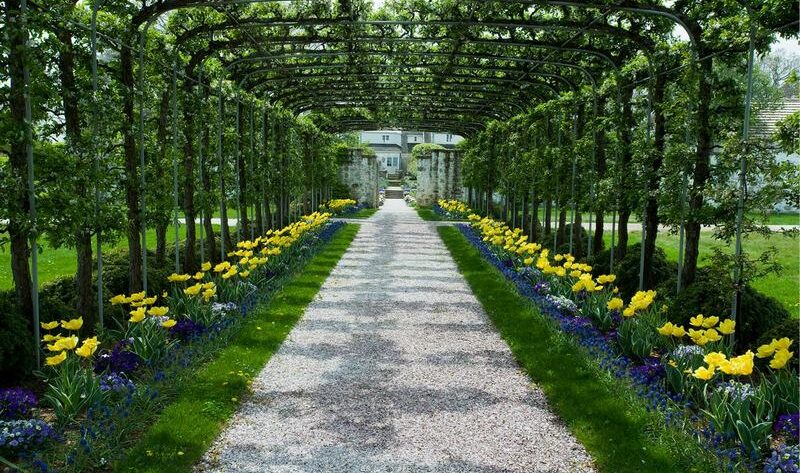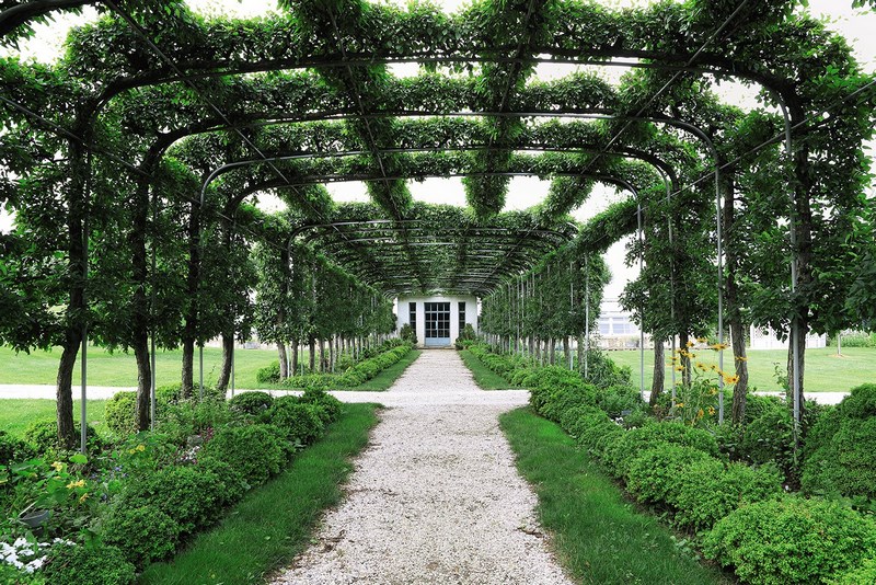 En el jardín destacan dos elementos: un largo túnel a base de árboles de manzano variedad ‘Mary Potter’ que fueron entrenados para crecer en un dosel y que Bunny Mellon podaba minuciosamente. Esa pérgola conduce a un encantador invernadero donde el artista francés Fernand Renard creó murales de trampantojo (trompe l’oeil) que van desde el suelo hasta el techo. Una maravilla ver esas imágenes en las que tienes que fijarte bien para poder distinguir dónde termina la realidad y donde comienza la fantasía.
