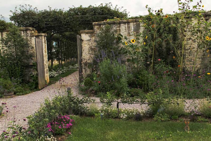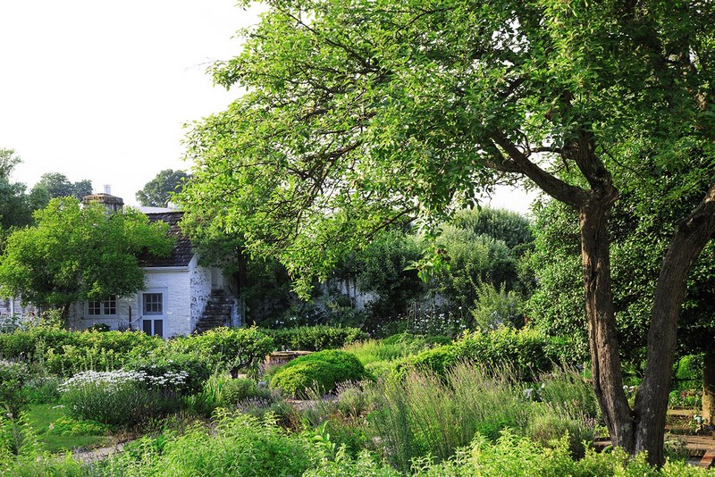 La casa conduce al jardín, que se define por terrazas pavimentadas qu se suavizan con plantación de tomillo; paredes de piedra encaladas, pequeños estanques y árboles frutales en espaldera. A juzgar por su estructura, puede hacernos pensar en un hermoso jardín campestre francés, aunque también está inspirado en jardines amurallados medievales.