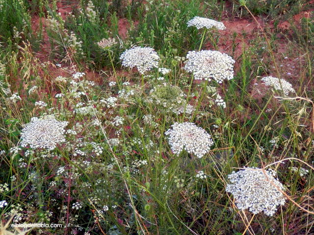 Mi favorita es la de la zanahoria silvestre (Daucus carota ssp. carota) de la que hablé en esta entrada. En ese enlace podéis tener algo más de información y curiosidades sobre su inflorescencia en umbela de umbelas.