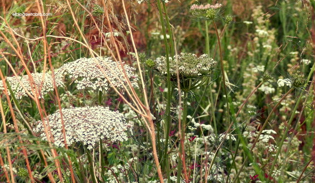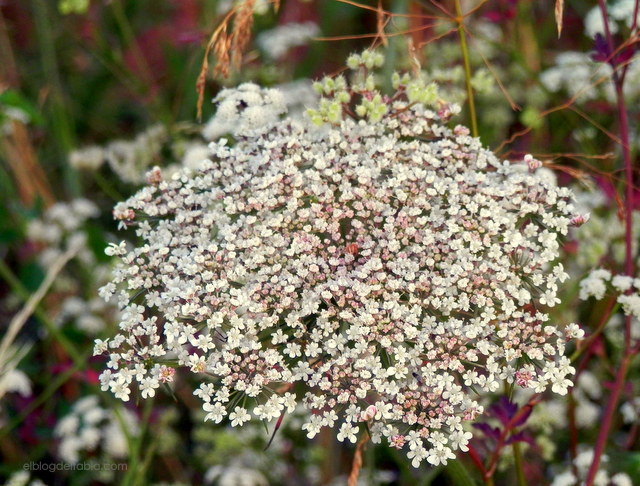 Pero me consta que no soy la única fan de las umbelas secas de la zanahoria silvestre. Y es que probablemente sea una de las más bellas entre todas las inflorescencias secas que pueden verse en los jardines cuando éstas no se cortan, lo que favorece la autosiembra y, al mismo tiempo, añade interés al jardín durante los meses en los que la floración es escasa. Si os interesa leer algo más sobre el tema, podéis consultar el artículo que publiqué (con algunas de mis reliquias de otoño) titulado Piet Oudolf en cuatro estaciones (más una).