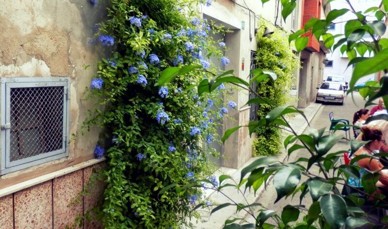 Para conseguir algún guiño a la belleza en esos lugares, las plantas, cómo no, son infalibles. Plantadas en el suelo o macetas y jardineras. En las ventanas. Con ostentación o con modestia. Con flores o sin ellas. Las plantas siempre ayudan a ver la cara amable del espacio urbano y, en este caso, a dar una salida feliz a esos callejones. Y para muestra un botón, o mejor una imagen, que vale más que un botón. Un callejón sin salida que, por obra y gracia de la terraza de un horno de pan con cafetería y dos trepadoras (Plumbago capensis), se ha convertido en un rincón con cierto encanto.