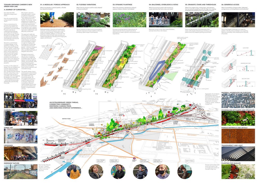 Tras cinco meses de búsqueda del equipo de diseño del nuevo parque elevado, seleccionaron 5 finalistas entre 75 proyectos. El pasado 15 de febrero anunciaron que el diseño de Camdem Highline había sido adjudicado al equipo multidisciplinario dirigido por James Corner Field Operations –la firma detrás de South Park en Queen Elisabeth Olympic Park de Londres y la High Line de Nueva York– que trabajará con vPPR Architects con sede en Kentish, el artista londinense Hew Locke, la organización especializada en diseño de espacios urbanos comunitarios Street Space y el diseñador de jardines holandés Piet Oudolf, entre otros.