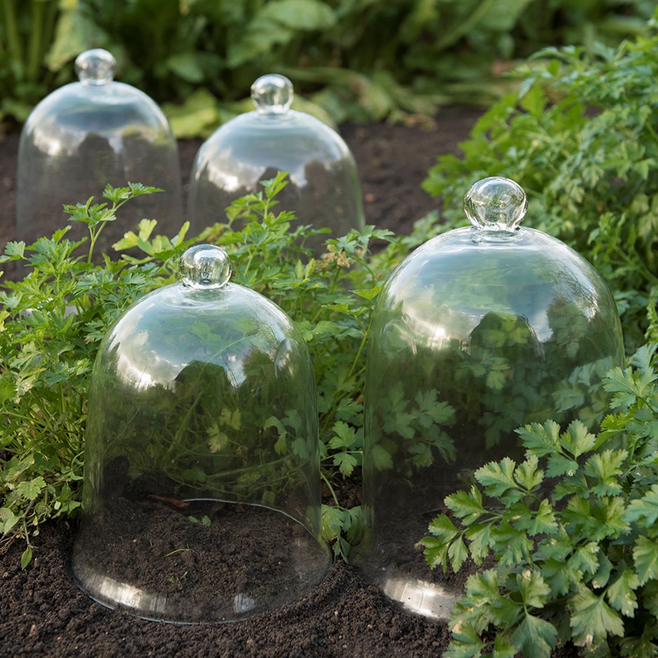 Para la protección de plántulas y plantas jóvenes o como elemento decorativo en el jardín, el porche o el interior del hogar. Las llamadas campanas victorianas o cloches de jardín son invernaderos a muy pequeña escala, que no siempre resultan tan útiles como quisiéramos, pero, en cualquier caso, son una forma de añadir belleza y encanto allí donde las plantas lo requieran.