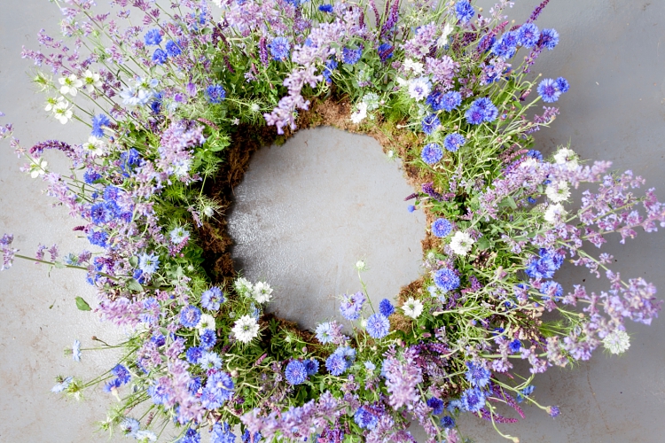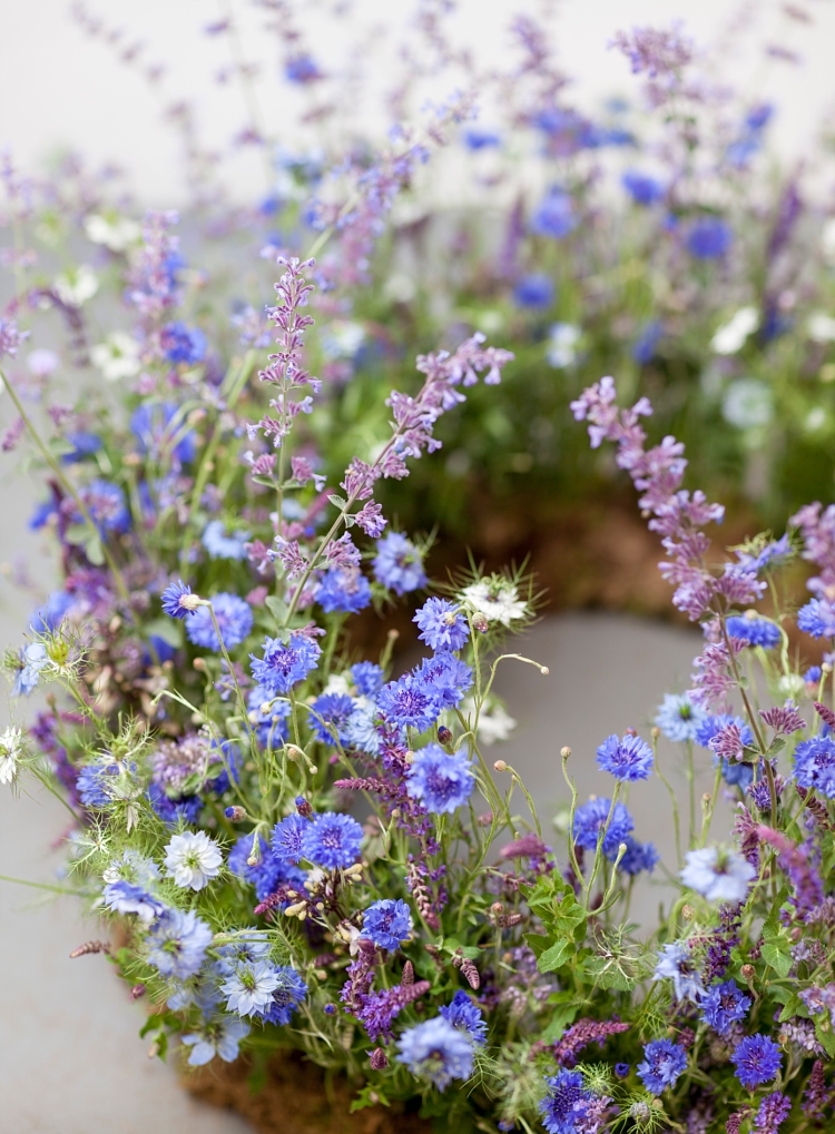 El tercer trabajo –Floor Based Wreath– es fantástico. Presenta una corona de gran tamaño, donde diversas flores, en tonos azules y morados, de Salvia, Nigella, Centaurea y Phacelia, ocupan un lugar central.  Al estar situada en suelo, parece haber crecido allí, sugiriendo un aspecto totalmente natural e incontrolado.