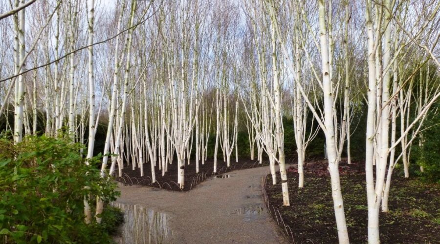 Los abedules (Betula) son apreciados en paisajismo debido a sus distintivas cortezas, especialmente los de corteza blanca que brilla bajo la luz del sol invernal
