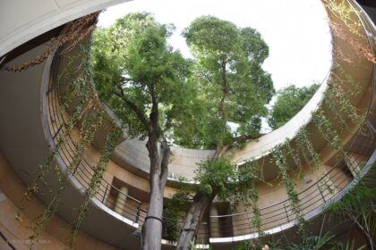 Almez (Celtis australis) en el patio circular del edificio de investigación del Jardín Botánico de …