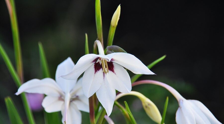 Gladiolus murielae, una planta bulbosa amante del sol, que despliega elegantes flores blancas con manchas moradas entre agosto y octubre