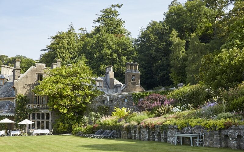 Hotel Endsleigh (Devon). Gran terraza formal con larga bordura de flores mixta. Diseño original de …