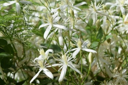 Un clemátide mediterránea de crecimiento rápido y vigorosa, con masas de pequeñas y fragantes flores blancas en verano