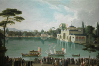 “Una bulliciosa muchedumbre contempla el paseo de las falúas Reales donde viajan el rey Fernando …