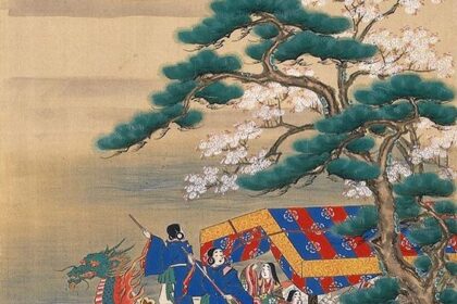 Un pino con 40 raíces levantadas a unos 2 metros del suelo, una linterna japonesa …