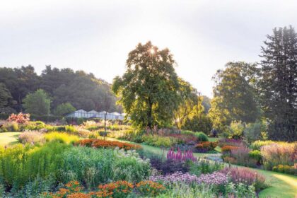 Largas camas llenas de plantas vivaces en flor y gramíneas ornamentales ofrecen una mezcla de colores y texturas que contrastan con el fondo del bosque en Harlow Carr