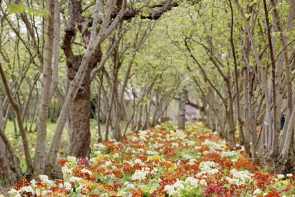 “Polyanthus flowers growing between lines of hazel trees in the Nuttery at Sissinghurst Castle” (detalle) …