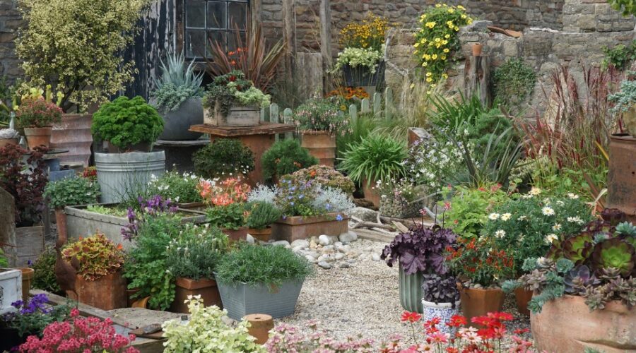 Un libro con ideas inspiradoras y consejos para diseñar exhibiciones de plantas en macetas y contenedores con interés en todas las estaciones.