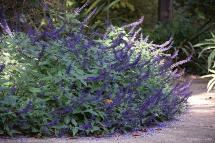 Salvia ‘Indigo Spires’ produce largas y densas espigas de flores aterciopeladas de color azul índigo que ondean sobre el follaje verde oscuro
