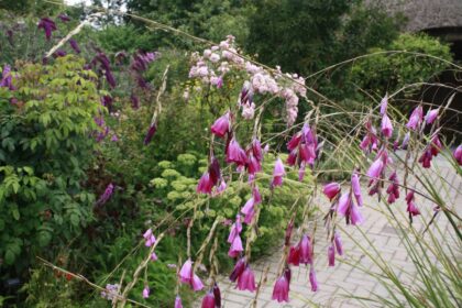 Dierama pulcherrima en RHS Garden Rosemoor Cottage Garden • RHS Alta y arqueada, con hojas …