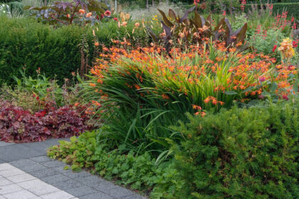 Crocosmia (Montbetria) ‘Rheingold’, Ricinus communis, Canna, Taxus, Heuchera ‘Sparkling Burgandy’ Aunque en el medio silvestre florece …