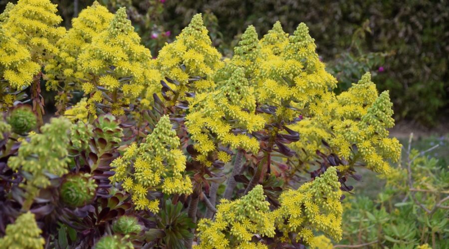 En invierno, Aeonium arboreum ‘Atropurpureum’ produce exuberantes inflorescencias con abundantes flores amarillas, que adoran las abejas