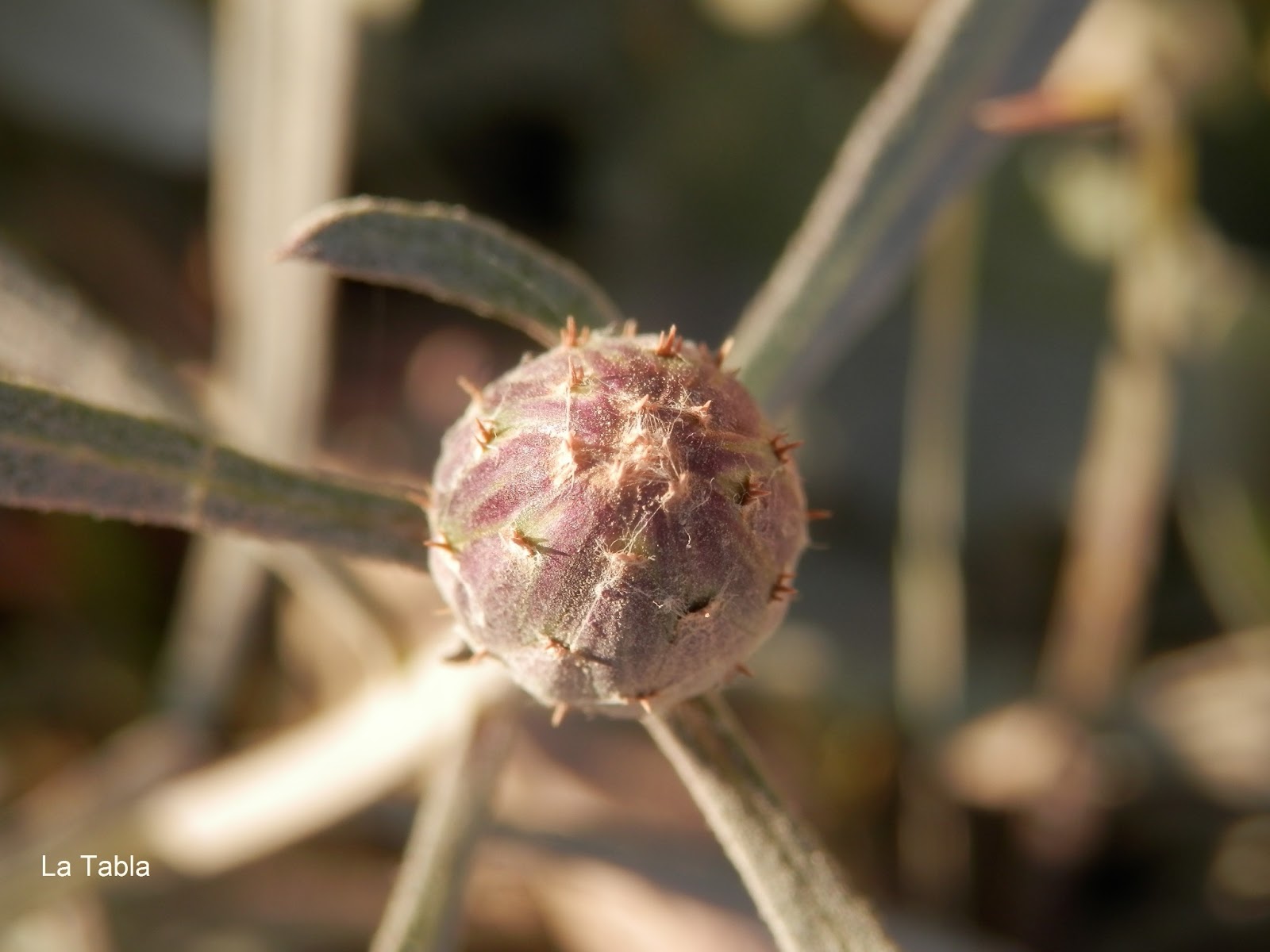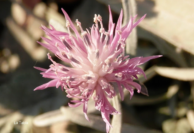 Es imposible no verla, aunque escasea. Cuando paso, sólo hay una, pero el color púrpura de su pequeña flor la anuncia a bombo y platillo. Centaurea paui Loscos ex Willk.