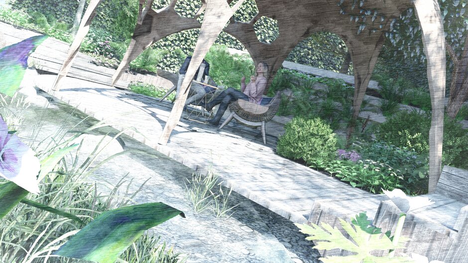 En The Florence Nightingale Garden: A Celebration of Modern-Day Nursing la madera es el material de construcción elegido para una serie de estructuras de jardín, debido a sus credenciales verdes que bloquean el carbono. Los contratistas están trabajando con los diseñadores para adoptar métodos de construcción alternativos y optando por evitar materiales de un solo uso como el cemento y el hormigón.
