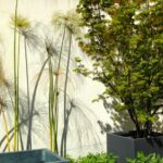En contraste con el blanco, la vegetación viene de la mano de árboles como Koelreuteria paniculata, con follaje fino, sorprendentes flores amarillas en verano y deliciosos frutos en forma de linterna en otoño. También aparecen Geums, Euphorbias, Iris germanica ‘Kent Pride’ y Macleaya microcarpa ‘Kelways Coral Plume’.