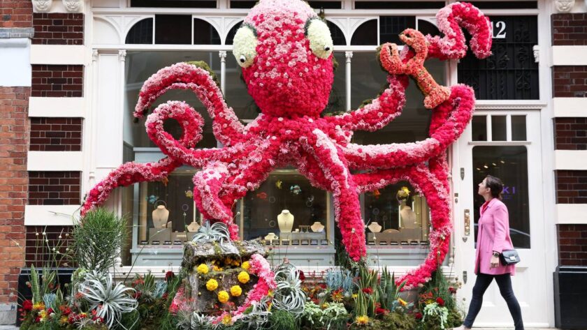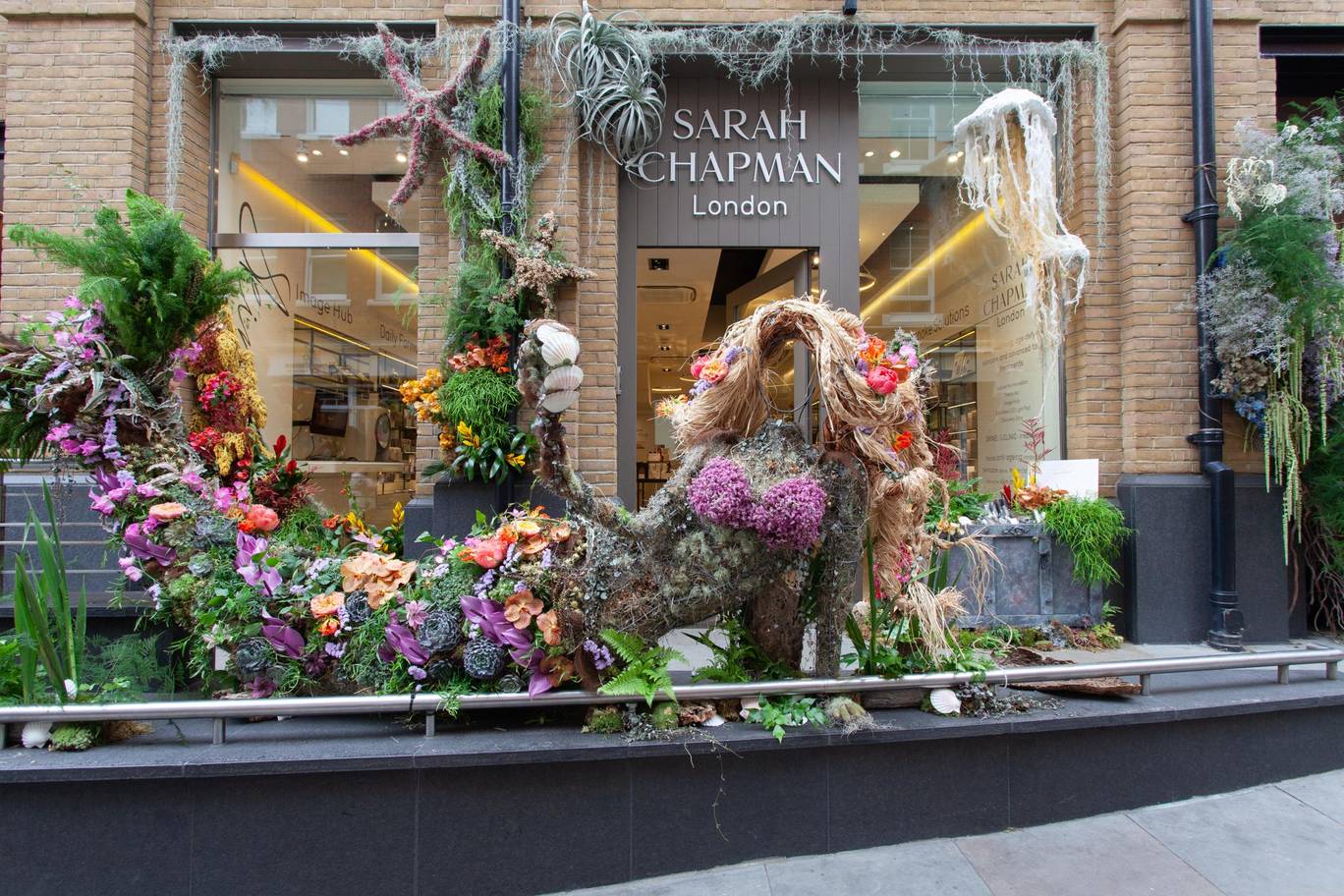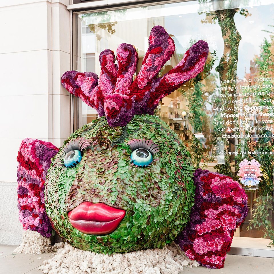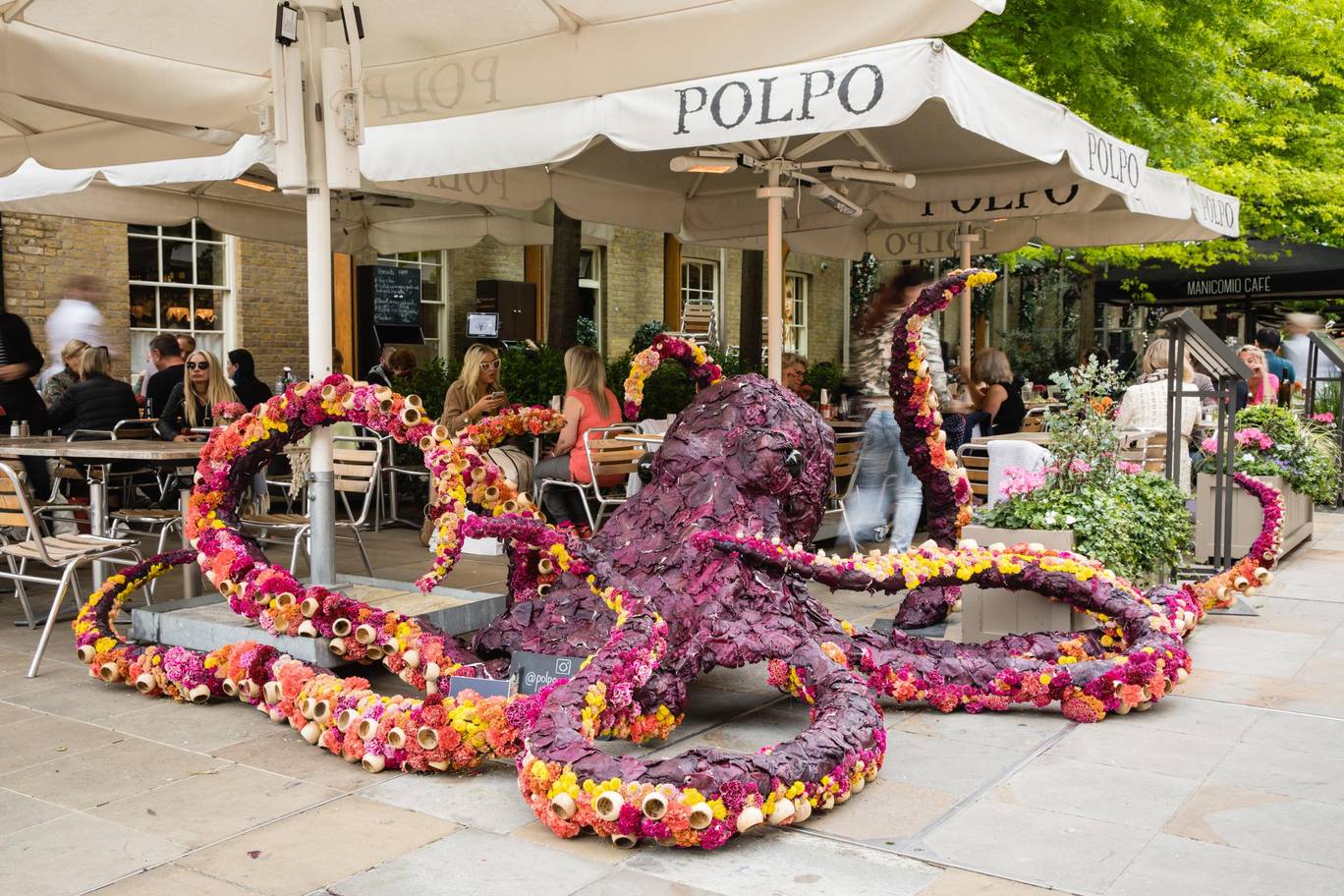 En Pavilion Road hay una instalación floral gigante de 4 metros de altura que representa una orca y se ha creado a base de hojas tropicales, delfinios, hortensias y gypsophila espumosa. Mientras tanto, en la Plaza del Duque de York, los floristas ‘Maison de Fleurs’ han creado una tortuga gigante compuesta de una mezcla de especies vegetales, que incluyen diferentes plantas suculentas, musgo y flores de colores brillantes.