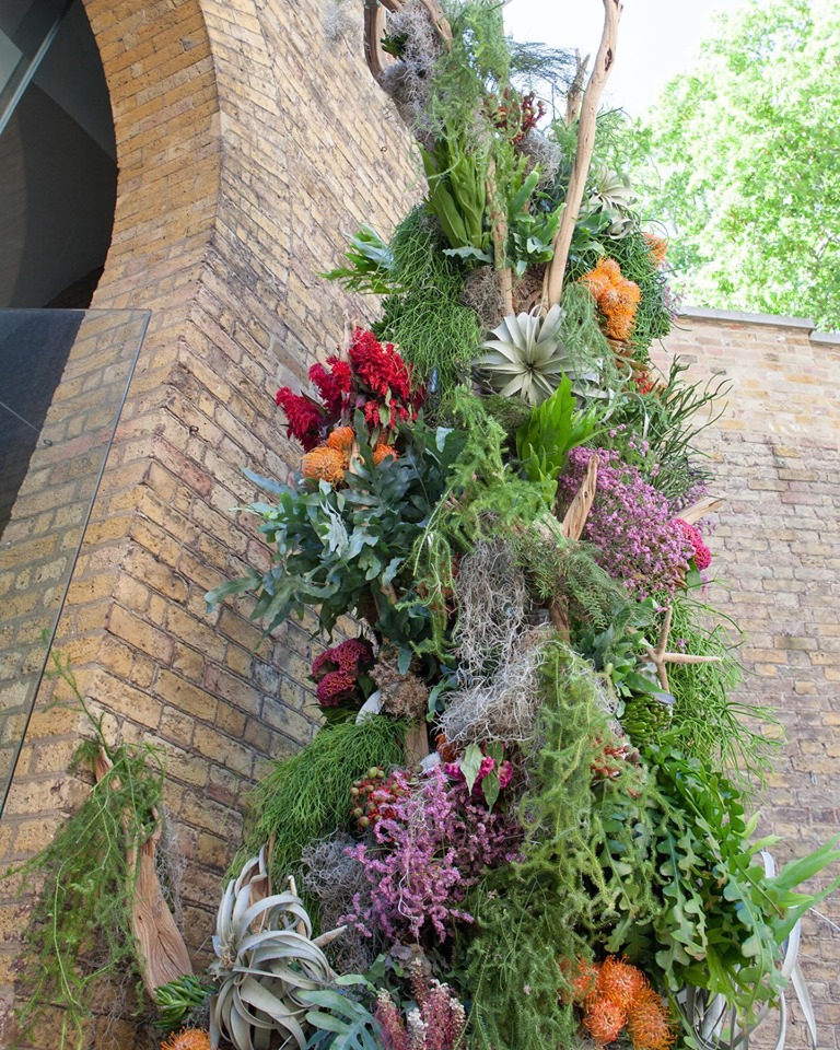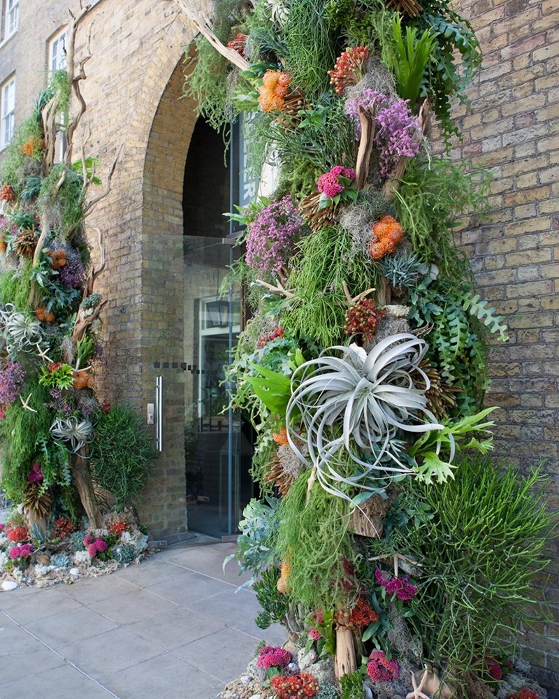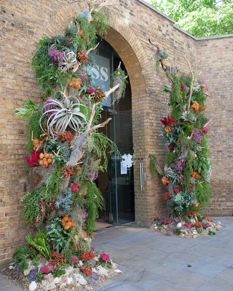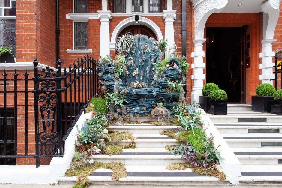 En la entrada del hotel de lujo 11 Cadogan Gardens nos espera el trono de Neptuno y una alfombra de corales y tesoros creados con plantas inusuales. Un diseño creado por Larry Walshe, que también ha realizado otras instalaciones en esta edición de Chelsea in Bloom, entre ellas el simpático y lujoso pez con ojos y labios sumamente atractivos para fomentar la interacción humana.