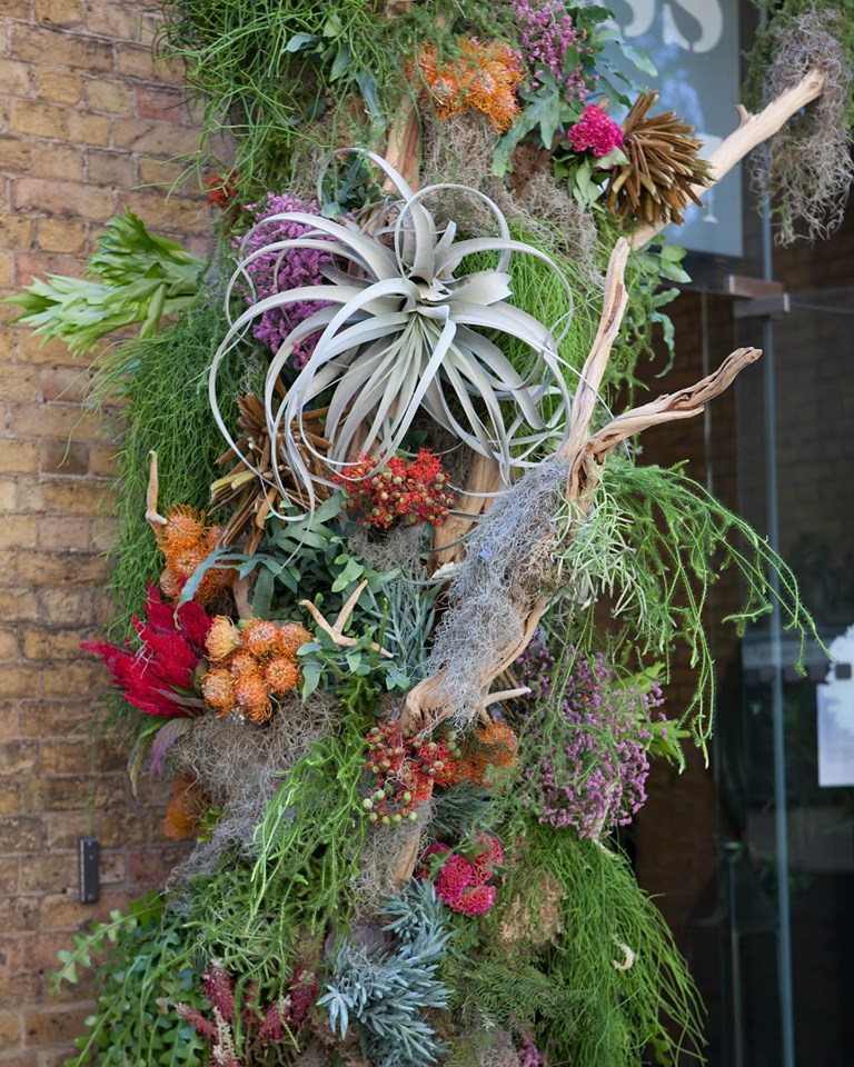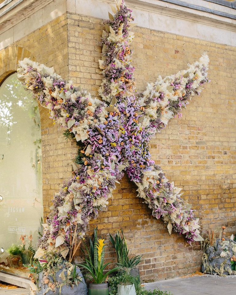 En la floristería Grace & Thorn, se aferra junto a la ventana una preciosa estrella de mar construida con una hermosa mezcla de flores secas, semillas, hierbas y hojas de palmera.
