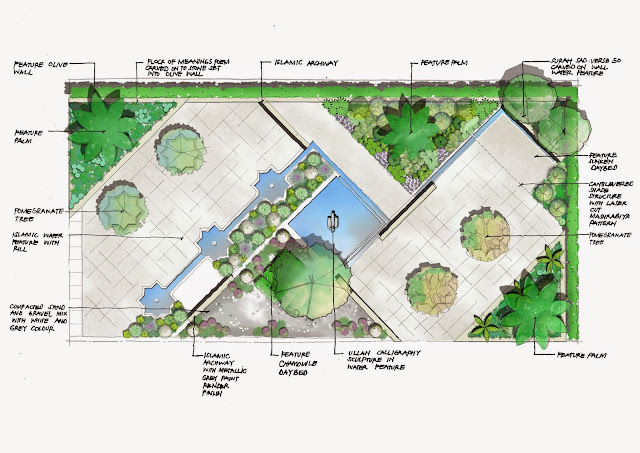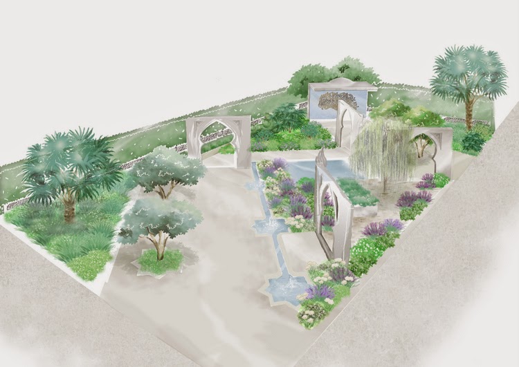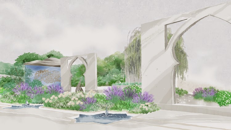 La estructura de The Beauty of Islam (La belleza del Islam) es en ángulo de 45 grados, que rompe con el clásico cuadrante de los patios árabes. El jardín estará impregnado de los aromas y colores de la antigua ruta de las especias del imperio árabe, que se extendía por mar -desde el Océano Índico, el Lejano Oriente, India, Golfo Pérsico y el Mar Rojo- y por tierra, en Europa. Evoca esa riqueza vegetal la presencia de higueras y granado, jengibre, romero y cardamomo. También incluye Nannorrhops ritchieana arabica, una palmera originaria de la Península Arábiga, con hojas azul-plateadas y muy apreciada por su resistencia al frio. Otra palmera que se verá en ese jardín es la Bismarckia nobilis. Hay más plantas, como el olivo o el jazmín, el naranjo: y mucha historia que contar, extensa y exuberante.