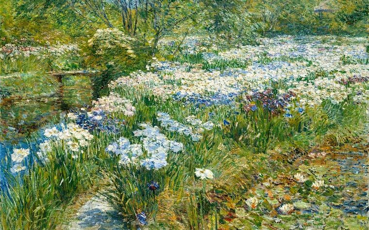 Arte y pintura. Flores y más flores. Córdoba y Granada; París y Nueva York. Mujeres y luz. Impresionismo europeo y Claude Monet. Impresionismo americano y Childe Hassam (1859-1935). Su credo: «El hombre que va a pasar a la posteridad es el que pinta su propio tiempo y las escenas de la vida diaria a su alrededor». Su mérito, saber capturar del mismo modo la vida en la ciudad y la vida en el campo. Su logro, ser considerado pionero del impresionismo americano. Oleos sobre lienzo para una tarde de verano, o más: Childe Hassam.