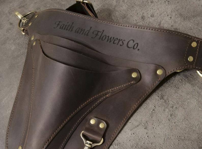 La bolsa contiene 3 bolsillos adaptados para tijeras de podar, tijeras pequeñas, cuchillo y un bolsillo grande para guardar el teléfono, las herramientas, las ataduras y los accesorios a mano. Hecho de cuero curtido en aceite de alta calidad que es flexible y duradero con un profundo brillo marrón chocolate.